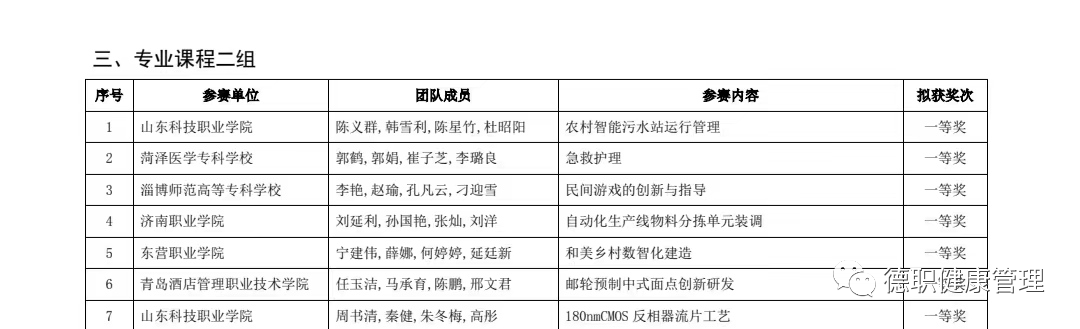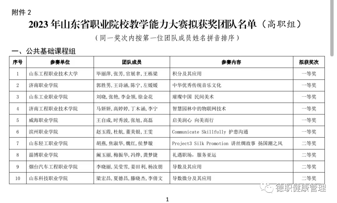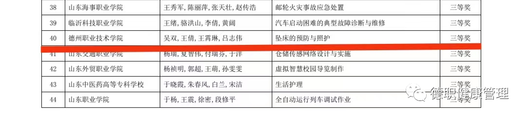 近日,由山东省教育厅主办的2023年山东省职业院校教学能力大赛拟获奖团队名单公布,吴双、王倩、王霄琳、吕志伟老师的参赛作品《坠床的预防与照护》获山东省职业院校教学能力大赛(高职组)专业课程二组三等奖,本次大赛是对学院员工教学能力的实战检验,同时彰显了我校年轻员工的精神风貌。