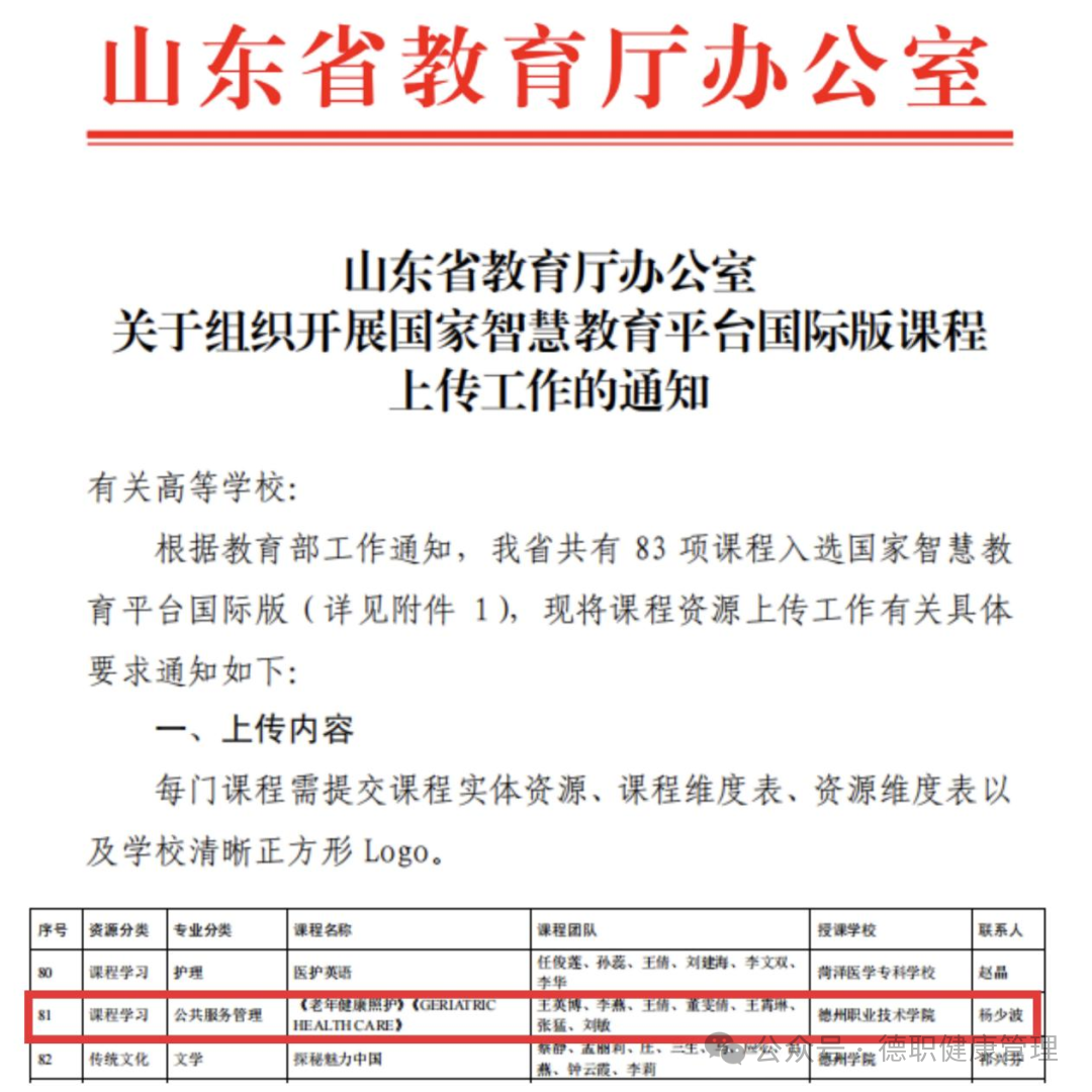 近日,山东省教育厅下发《关于组织开展国家智慧教育平台国际版课程上传工作的通知》,山东省共有83项课程入选国家智慧教育平台国际版,我校《老年健康照护》全英文课程成功入选国家智慧教育平台国际版。
