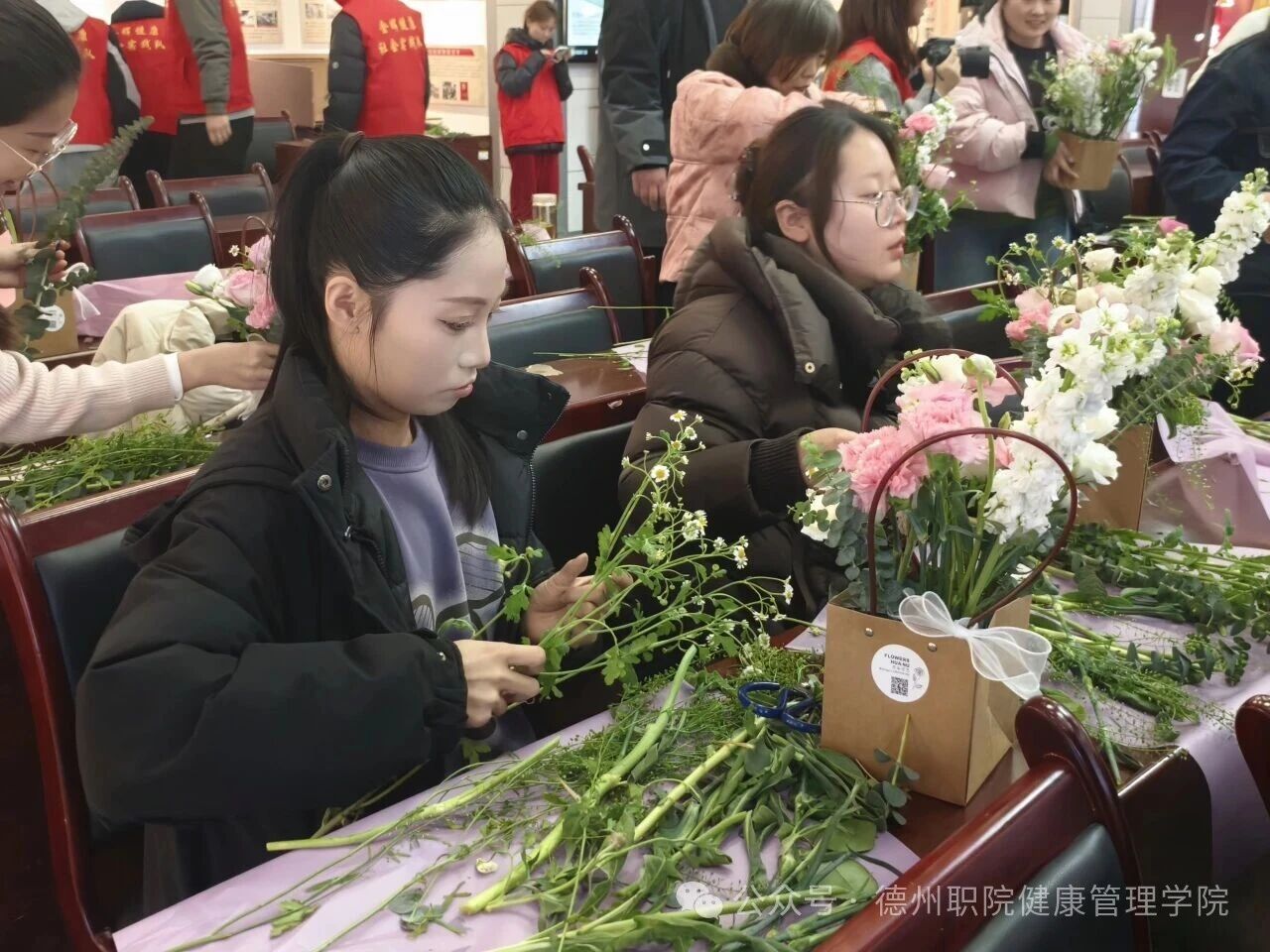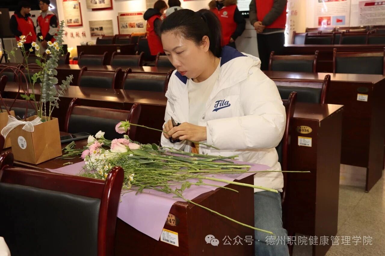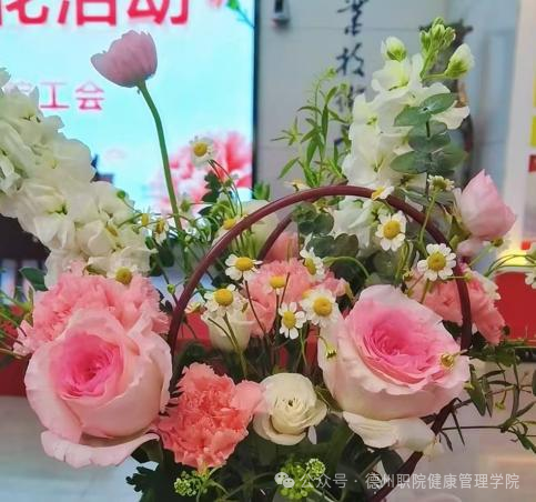 活动现场花香馥郁,春意盎然。主办方精心准备了洛神玫瑰、洋牡丹、洋甘菊等多种新鲜花材,并特邀专业花艺师进行现场指导。花艺师细致讲解了花卉选择、色彩搭配、造型设计等插花技巧与日常养护知识。在温馨愉悦的氛围中,女教职工们兴致盎然,边学边做,充分发挥创意与巧思,精心构思、修剪搭配,在交流协作中创作出一件件独具匠心、生机盎然的插花作品,在感受美、欣赏美、创造美的过程中,充分体验了手工创作的乐趣与艺术生活的雅致。