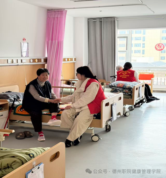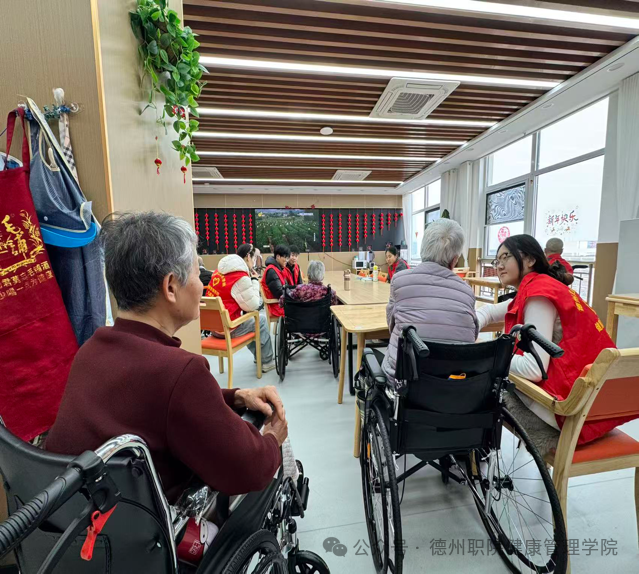 活动现场,一抹抹“志愿红”穿梭其间,同学们迅速分组,默契十足。有的同学细心推着轮椅,陪行动不便的老人晒晒太阳、看看风景,目光始终紧随着长辈的身影,确保每一步都走得安心;有的则围坐床边,拉着老人的手“话家常”——从过往的峥嵘岁月,到日常的吃喝起居,耐心地听、细细地问。这一来一回的问答间,养护院里的冷清被欢声笑语填满,原本独处的孤寂也被这股青春暖流轻轻抚平。